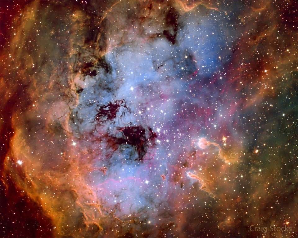 ما الذي يُحدِث الجلبة في سديم الشرغوف؟ تشكُّل النجوم. انبعاثٌ مُغبرّ في سديم الشرغوف، "آيسي 410"، يقع على بعد حوالي 12,000 سنة ضوئيّة في الكوكبة الشماليّة "مُمسِك الأعنّة" (Auriga). تمتدّ سحابة الغاز المتوهّج بعرض أكثر من 100 سنة ضوئيّة، منحوتةٌ بواسطة الرياح النجميّة والإشعاعات من عنقود النجوم المفتوح المُضَمَّن "إنجيسي 1893". تُرى عناقيد النجوم الساطِعة المُتشَكَّلة حديثاً -المُتشكِّلة في السحابة البينجميّة قبل 4 ملايين عاماً فحسب- في جميع أنحاء السديم المُشكِّل للنجوم.