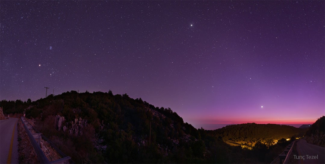 التَقَطَت الصورةُ المُختارة -المأخوذة في أواخر الشهر الماضي- كُلَّ هذه الكواكب وأكثر: القمر وكوكب عطارد كانا أيضاً مرئيَّين في الوقت ذاته. دون مستوى الرؤية كان الكوكبان نِپتون وأورانوس، جاعلَين هذه پانوراما لكلّ الكواكب تقريباً. توجد في المُقدِّمة تلالٌ حول القرية الصغيرة "گوكتشيأورين"، "كاش"، "تركيّا"، قُرب ساحل البحر الأبيض المتوسّط. النجوم الساطعة "النسر الطائر"، "فم الحوت" و"الدبران" هي بارزة أيضاً، بالإضافة لعنقود نجوم الثُّريّا.