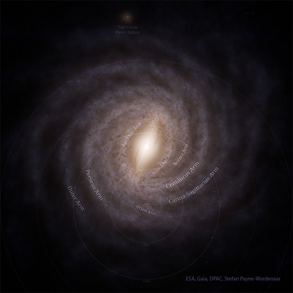 ما الذي تبدو عليه مجرّتنا درب التبّانة من الأعلى؟ نظراً لأنّنا في الداخل، ليس بمقدور البشريّة الحصول على صورة حقيقيّة. مؤخّراً على أيّة حال، صُنِعت هكذا خريطة تماماً باستخدام بيانات المواقع لأكثر من مليار نجم من مهمّة گايا التابعة لوكالة الفضاء الأوروپيّة.