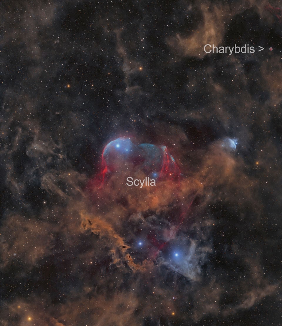 للمفاجأة، كان هناك اكتشافٌ آخر يتربّص أعلى اليمين: مُرشّح سديم كوكبي خافت وغير معروف سابقاً. وتماشياً مع التقاليد الأسطوريّة، أُطلِقَ عليه اسم كاريبديس (Sai 2) — في إشارةٍ إلى التعبير اليوناني القديم "الوقوع بين سيلا وكاريبديس" المأخوذ من أوديسة هوميروس.